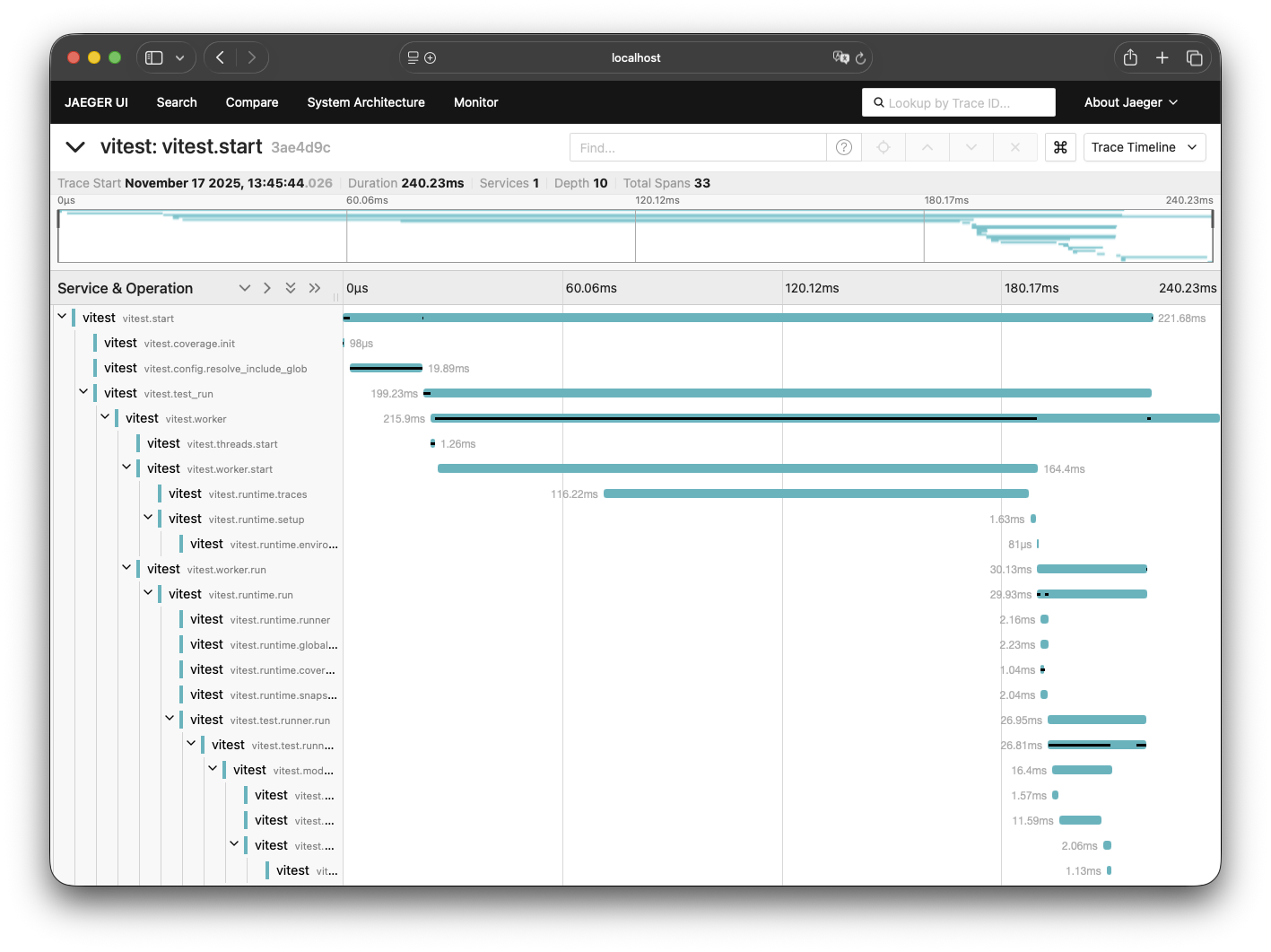 You can use the OpenTelemetry API yourself to track certain operations in your code. Custom traces automatically inherit the Vitest OpenTelemetry context: